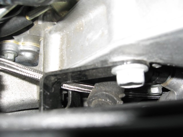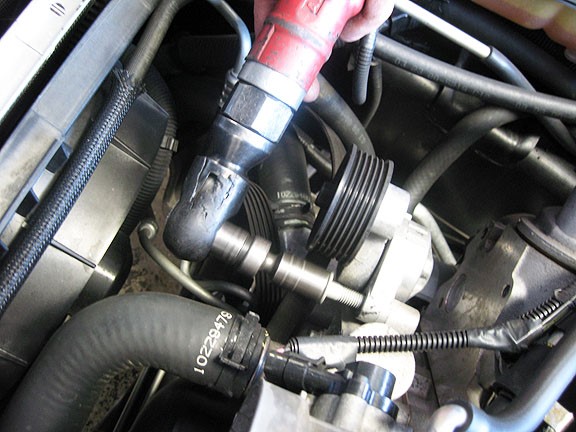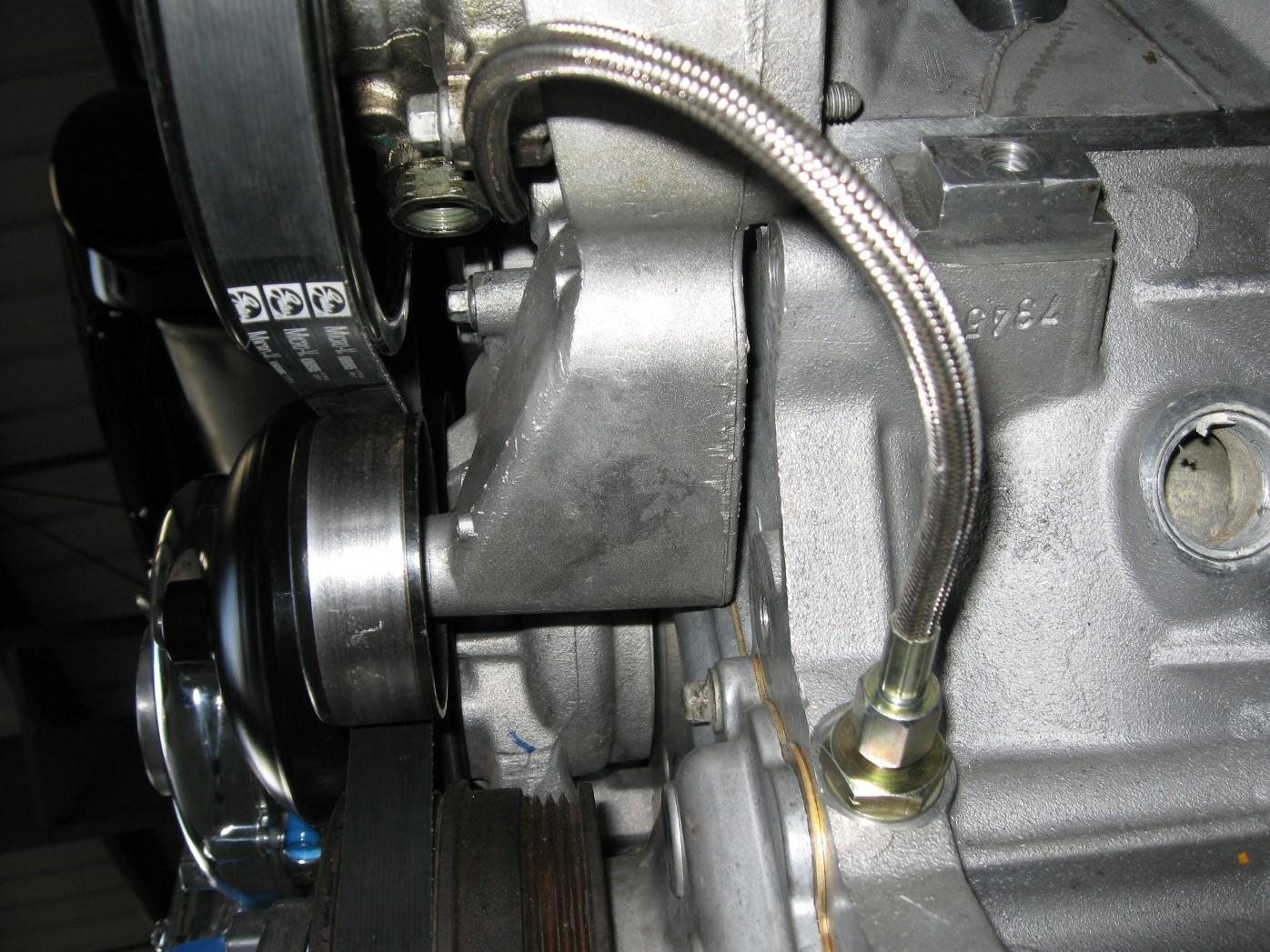 On V1, V2, and V7 models ONLY, you will need to connect the oil drain line to the supercharger before mounting it to the bracket. We use stainless AN line and it is extremely tight in this area. The line MUST be oriented as shown in the picture to avoid contact with the tensioner. Double check this clearance after the installation is complete.