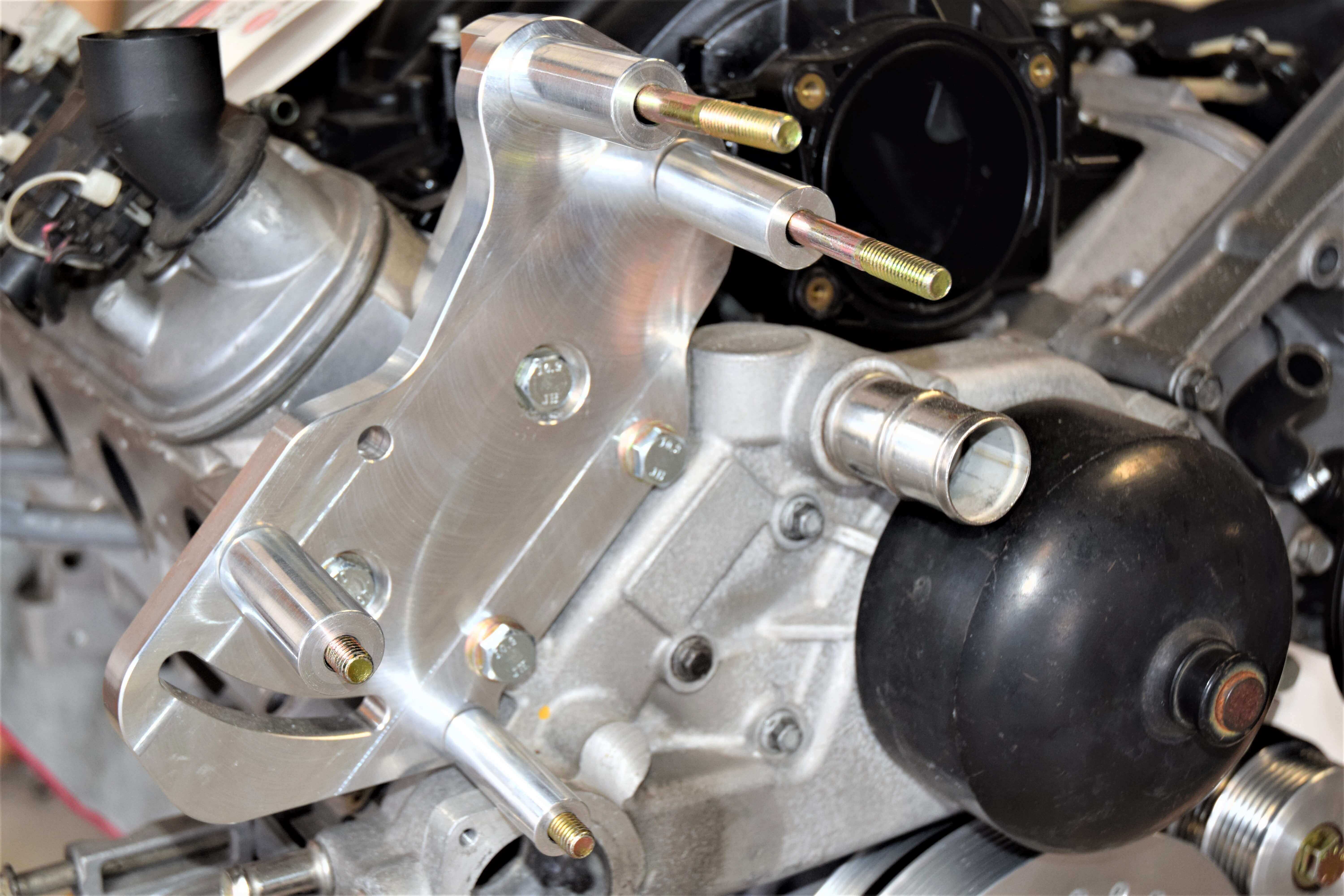 The rear bracket bolts to the water pump, using the (2) stock tensioner bolts and holes. It also bolts to the cylinder head with the M10x90mm bolts, a 2.460” spacer and the thick angle brace. Make sure you use a THIN washer on the M10 bolt that goes through the bracket and round spacer to the cylinder head. It’s also important to install the lower of the 2 long bolts that attach the supercharger/main bracket assembly through the rear bracket before mounting it to the engine. The intake manifold or cylinder head will not allow them to be installed afterwards. The spacer closest to the water pump is ¾” in diameter.