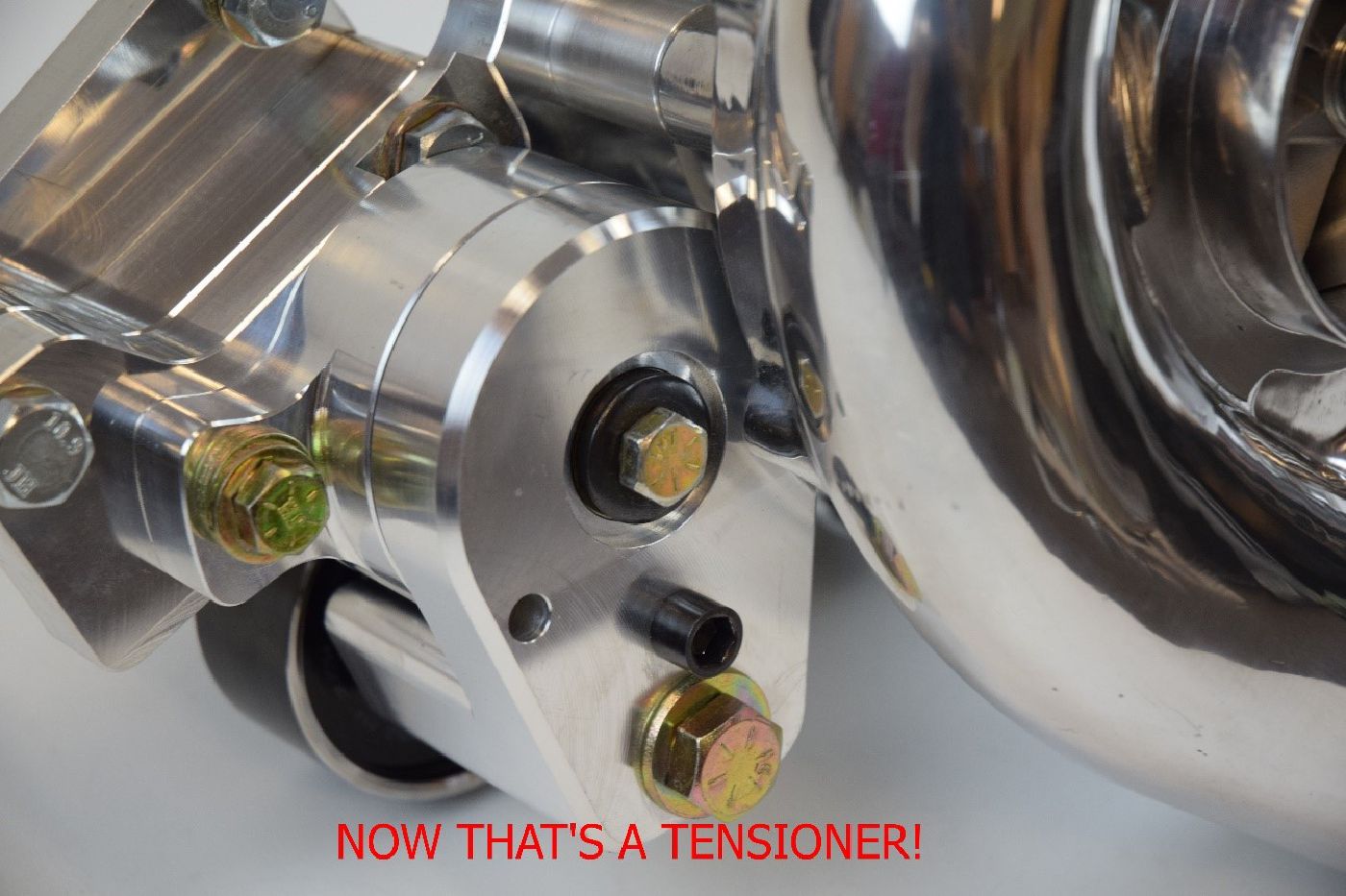 Our adjustable sliding idler, along with our adjustable billet tensioner, allows for full adjustment of both belt tension and wrap.